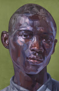 In the window of the gallery hangs Balthasar (above), an interpretation of an image he found in a newspaper. To view it within the gallery necessitates getting very close up. In doing so, one can see clearly the artist’s technique of broad converging brushstrokes in a patchwork verging on abstraction. With distance, outside the gallery window, one sees a rather beautiful portrait of a man with a gentle expression with an array of bright colours emphasising the light falling upon his dark skin.